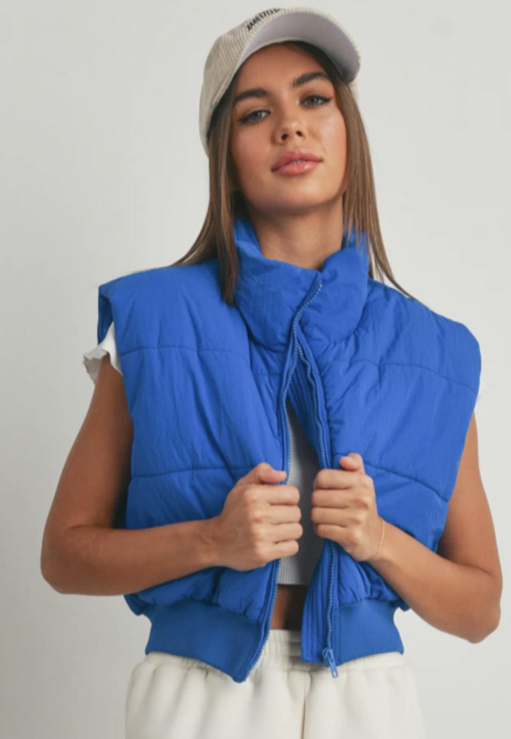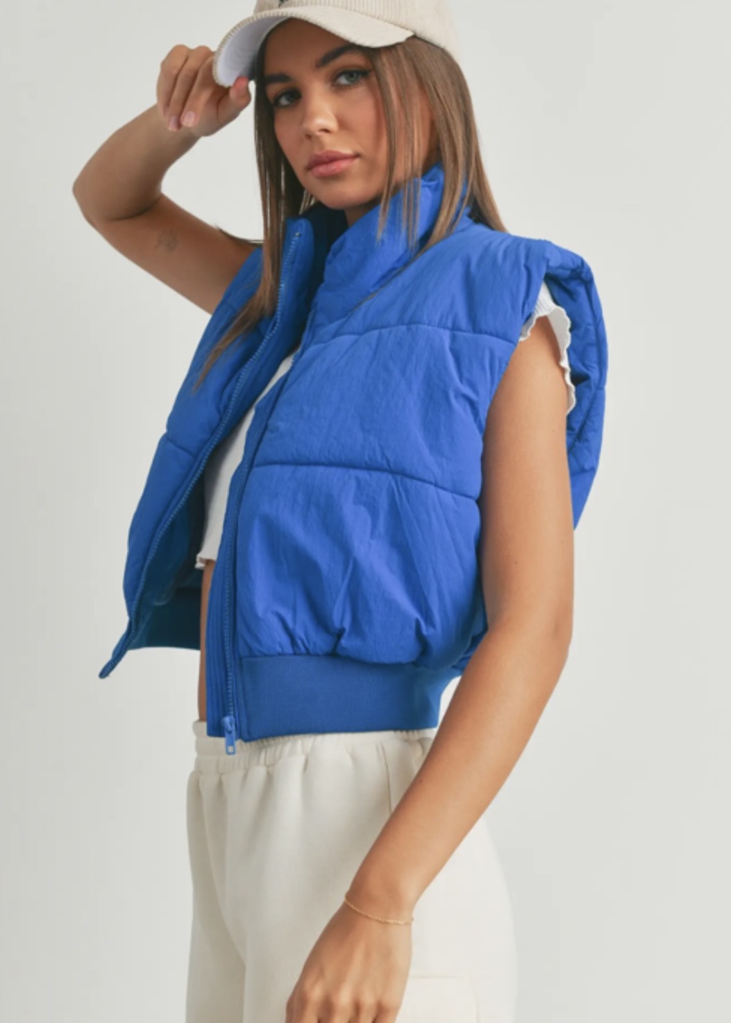 Make a statement in this cropped royal blue puffer, designed to turn heads while keeping your street style sharp. The sleeveless cut adds a modern, edgy twist, perfect for layering over hoodies, long sleeves, or fitted basics. With its bold color and padded warmth, it delivers just the right mix of function and fashion.
